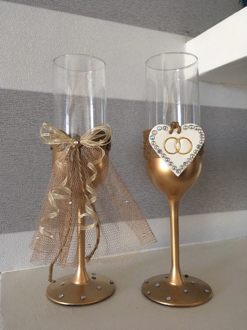 Оформление свадебных бокалов, свечей, бутылок шампанского, подставок и коробочек для обручальных колец в различных стилях.